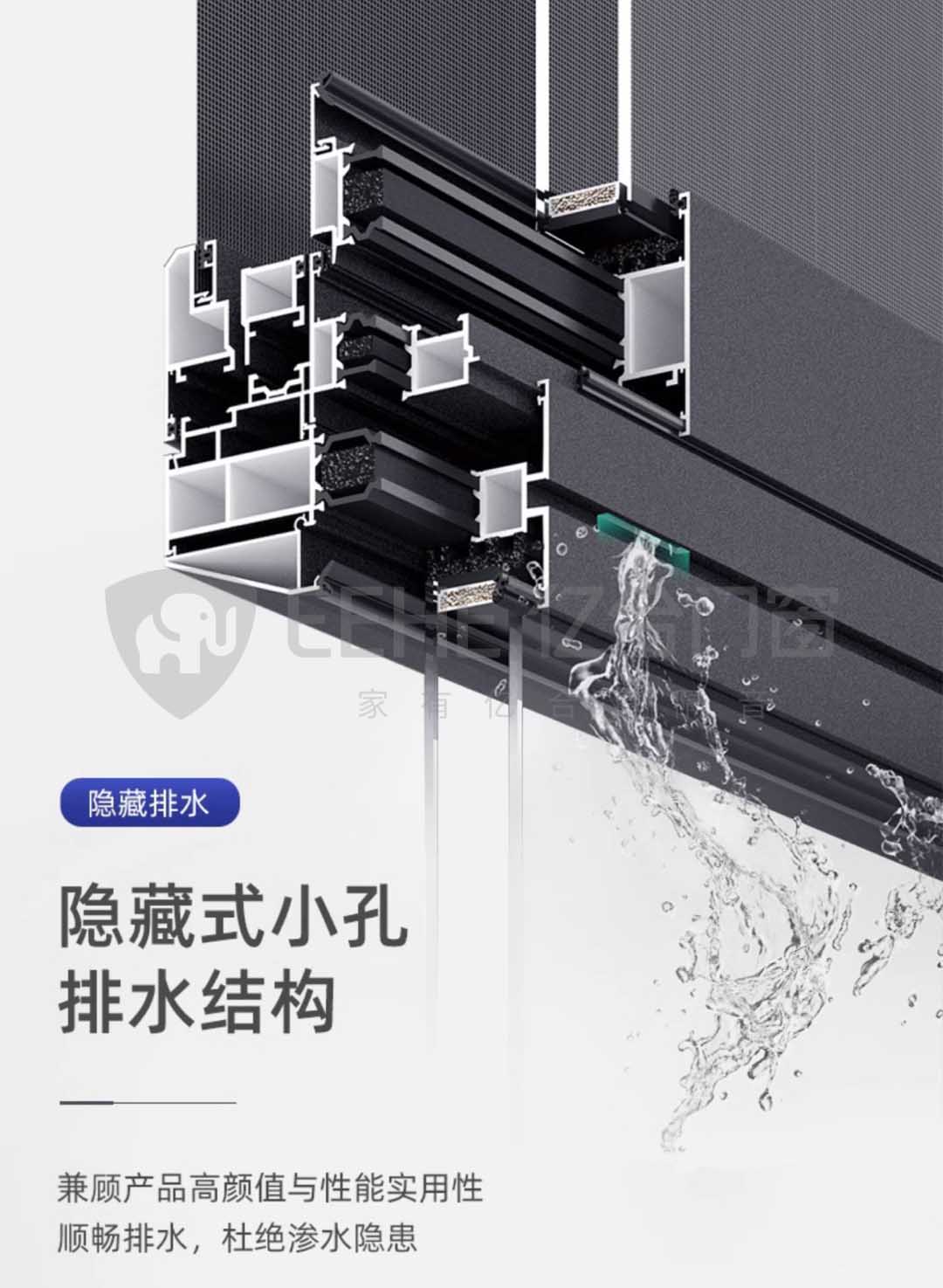億合門窗以用戶日常使用需求為核心,全方位、多角度地對產(chǎn)品細節(jié)進行升級與完善,采用腔內式隱藏排水結構,將排水路徑隱藏于整窗外框里,避免風直吹造成雨水倒灌室內,不僅達到平整美觀度,更有效幫助迅速排水,哪怕在面對暴雨襲擊時,也能做到“滴水不滲”。