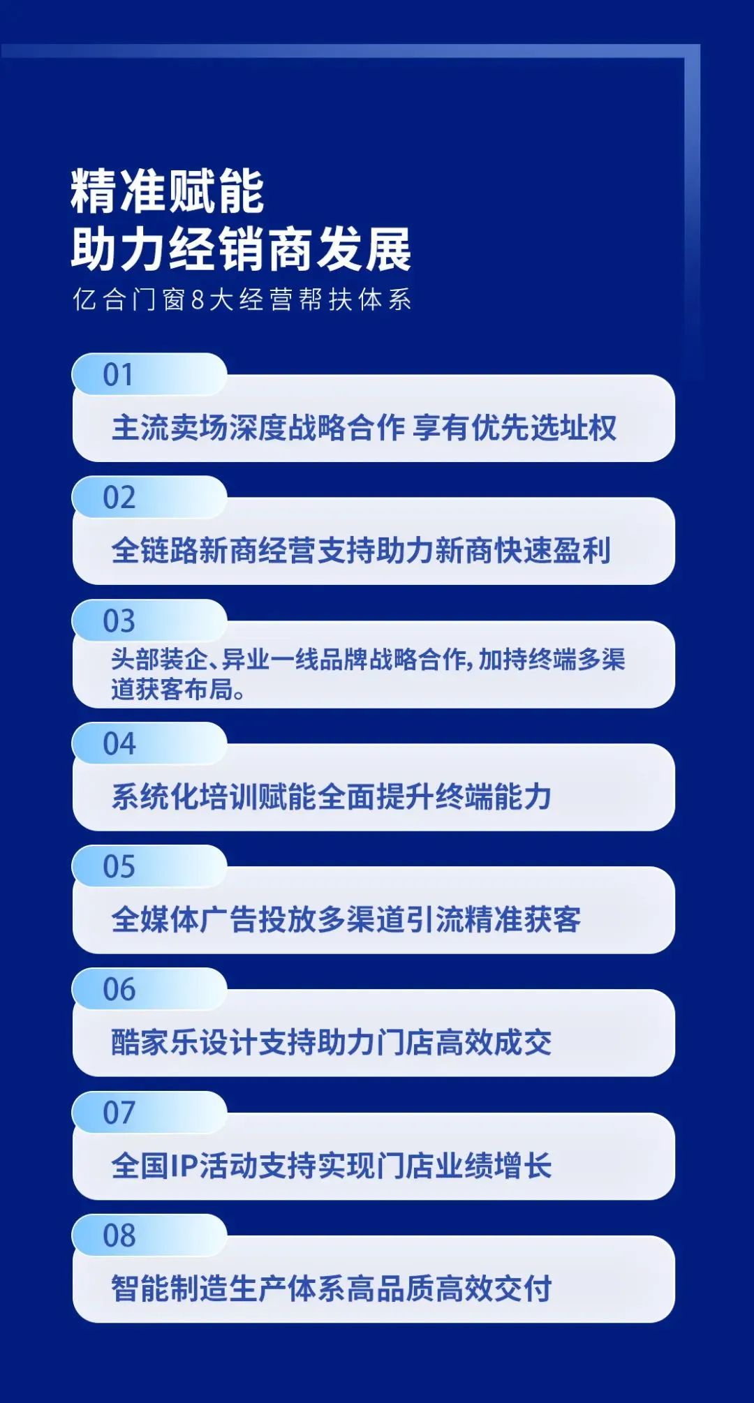 億合門窗始終把“合作共贏”作為發(fā)展的第一目標(biāo),在品牌升級、產(chǎn)品創(chuàng)新、終端建設(shè)、渠道拓展、推廣促銷、數(shù)字運營、團隊建設(shè)、售后支持等方面,給予經(jīng)銷商伙伴最大的資源傾斜和支持力度,攜手經(jīng)銷商共同鑄就最強終端,這是我們的宗旨,更是我們的承諾!