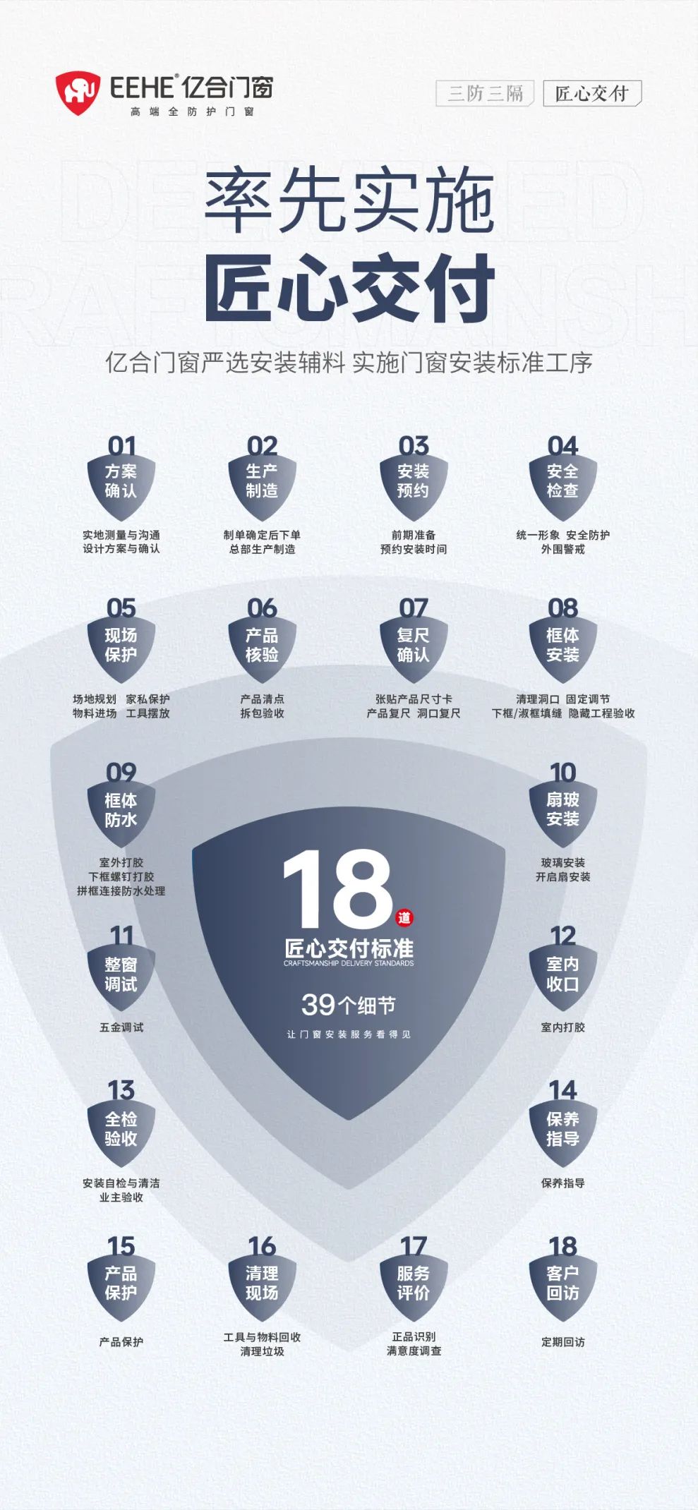 優(yōu)質(zhì)的門窗產(chǎn)品,離不開專業(yè)服務(wù)的支撐。億合門窗匠心交付服務(wù)體系,從方案設(shè)計(jì)、產(chǎn)品制造、安裝規(guī)范到進(jìn)度追蹤、售后保障等環(huán)節(jié),圍繞18道標(biāo)準(zhǔn),39個(gè)細(xì)節(jié)逐一制定規(guī)則,項(xiàng)項(xiàng)落實(shí)規(guī)范,貫穿全交付流程,讓每一份品質(zhì)承諾都落到實(shí)處,讓家呈現(xiàn)幸福模樣。