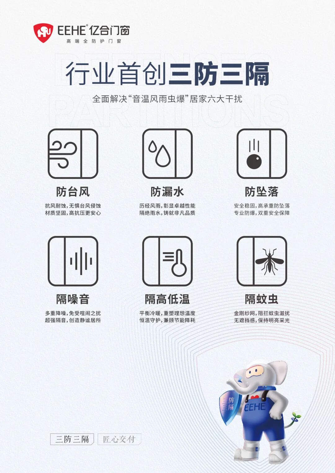 同時,億合門窗以創(chuàng)新為驅(qū)動,不斷提升產(chǎn)品品質(zhì)與性能,行業(yè)首創(chuàng)“三防三隔”全防護新標準,實現(xiàn)防臺風、防漏水、防墜落,隔噪音、隔高低溫、隔蚊蟲的門窗性能,重新定義門窗的安全與舒適維度,以硬核實力引領(lǐng)行業(yè)品質(zhì)升級,為用戶構(gòu)筑更高標準的理想居所。