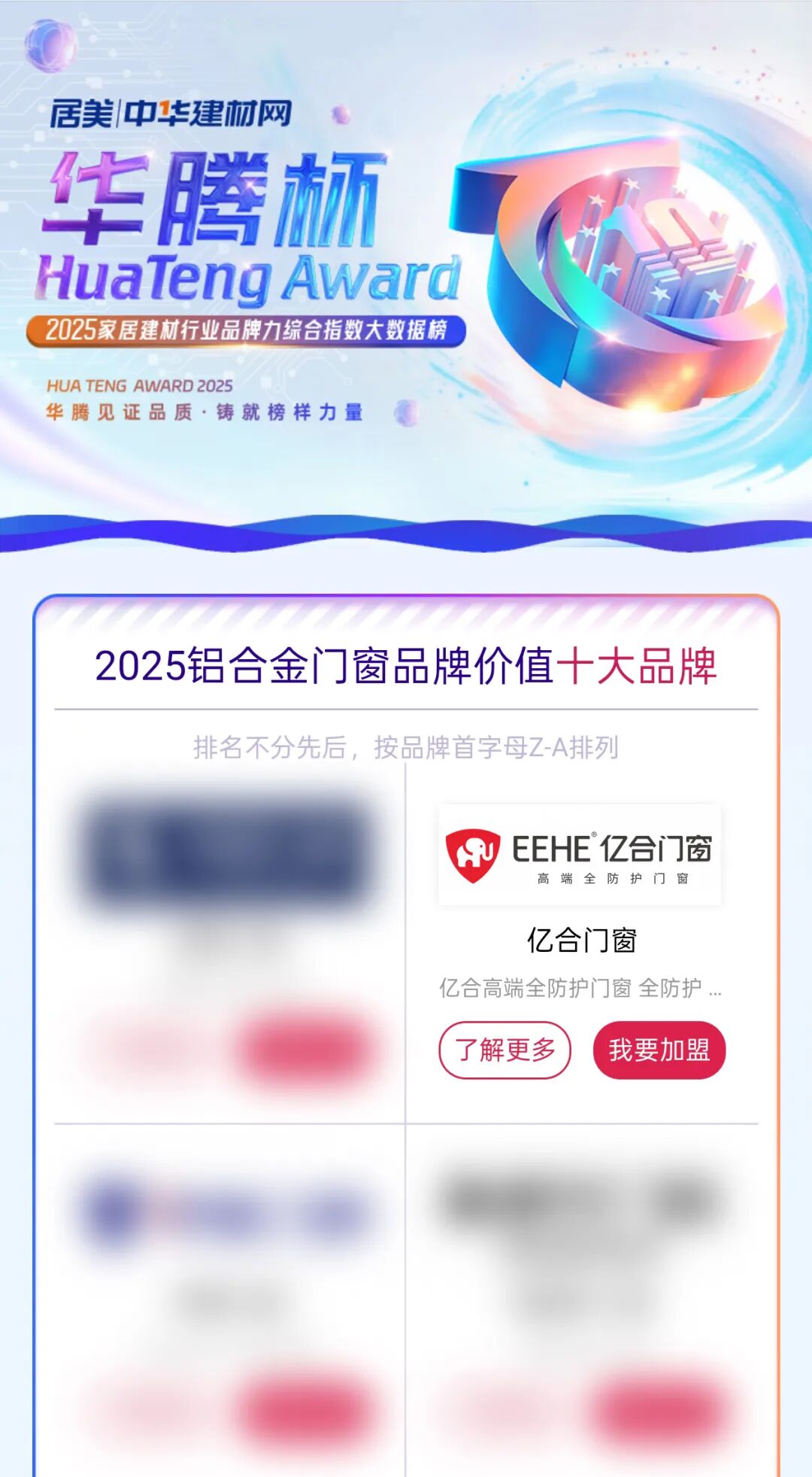 價值引領(lǐng)·樹立標桿 | 億合門窗榮膺2025華騰杯“鋁合金門窗品牌價值十大品牌”!