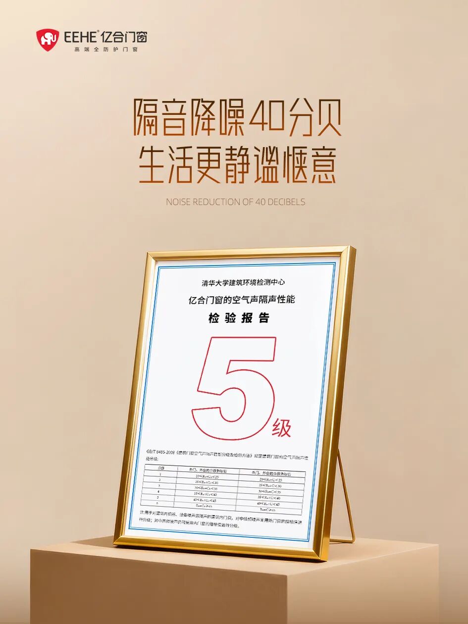 除此以外,億合門窗攜手清華大學(xué)建筑聲學(xué)實(shí)驗(yàn)室,共同提升門窗隔音降噪技術(shù),使門窗隔音降噪40分貝,并經(jīng)過清華大學(xué)建筑環(huán)境檢測(cè)中心權(quán)威檢測(cè),獲得「隔音檢測(cè)5級(jí)窗標(biāo)準(zhǔn)認(rèn)證」,在行業(yè)遙遙領(lǐng)先。無論是早晚高峰時(shí)段的車流轟鳴,還是鄰里日常的說話聲、電視聲,都能被牢牢阻隔在室外,讓室內(nèi)始終保持寧靜。