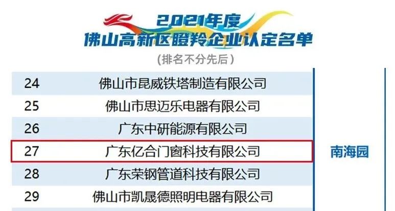 近日,佛山高新區(qū)管委會公布了2021年度佛山高新區(qū)瞪羚企業(yè)認(rèn)定名單,共有84家企業(yè)入選。億合門窗憑借企業(yè)綜合效益、卓越創(chuàng)新能力、高質(zhì)量發(fā)展等方面的突出成就成功上榜,榮獲2021年度佛山高新區(qū)瞪羚企業(yè)認(rèn)定。
