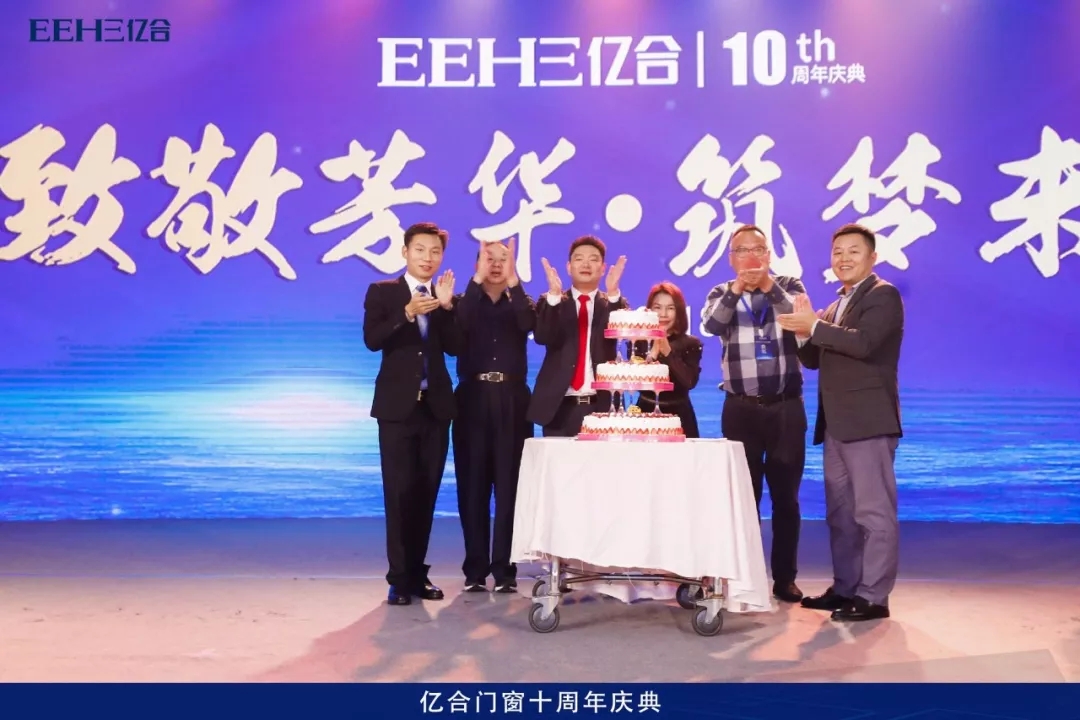 接著,億合門窗董事長曾奎先生及夫人、常務(wù)副總經(jīng)理胡超先生及重要嘉賓共同上臺(tái)切億合門窗十周歲生日蛋糕,為億合門窗十周歲的生日送上祝福。