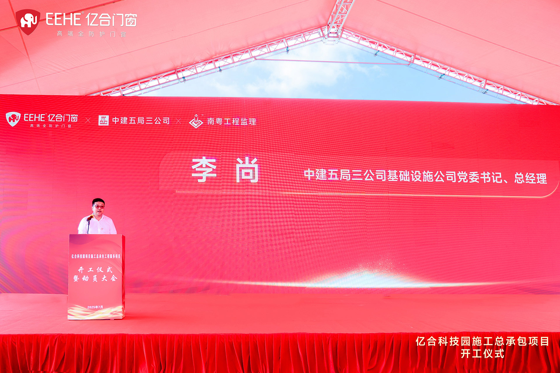中建五局三公司基礎(chǔ)設(shè)施公司黨委書記、總經(jīng)理李尚在講話中表示,作為項目承建方,參與億合科技園項目建設(shè)使命光榮、責(zé)任重大。中建五局三公司將堅持“以客戶為中心”、“以項目為中心”的管理理念。從前期策劃到竣工驗收,從重大節(jié)點到日常施工協(xié)調(diào),提供全天候、全方位服務(wù),建立高效順暢的溝通機制,及時滿足項目需求,助力億合科技園早日建成投產(chǎn),必將把億合科技園項目打造成為質(zhì)量一流、技術(shù)領(lǐng)先、綠色智能、安全高效的精品工程,樹立區(qū)域高端門窗產(chǎn)業(yè)基地新標(biāo)桿。并以此為依托,為推動當(dāng)?shù)禺a(chǎn)業(yè)升級、集聚配套資源、促進區(qū)域經(jīng)濟高質(zhì)量發(fā)展貢獻積極力量。