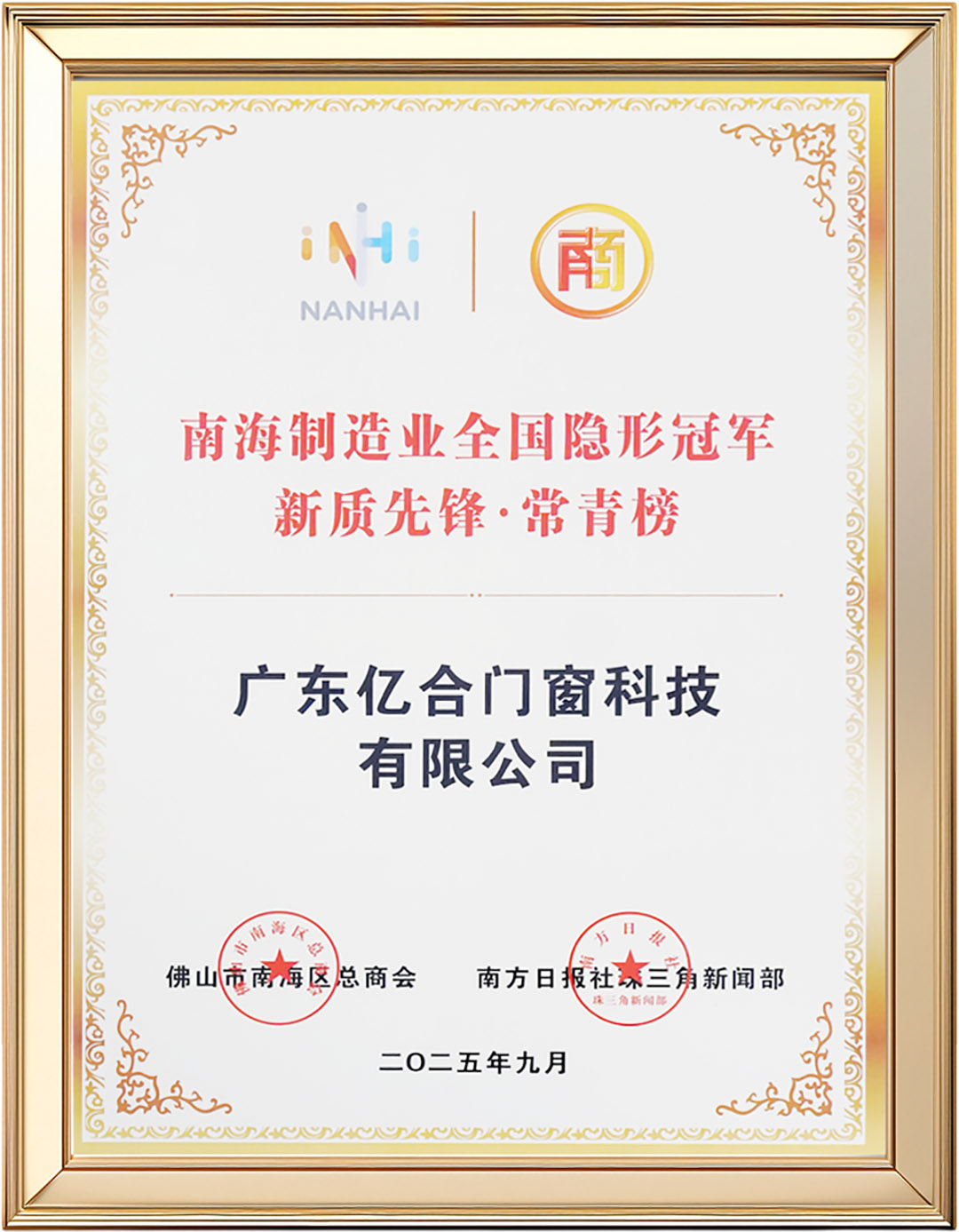 億合門窗榮登2025年“南海制造業(yè)全國隱形冠軍”新質(zhì)先鋒·常青榜,既是對(duì)過往發(fā)展成果的肯定與榮譽(yù)見證,更是對(duì)未來繼續(xù)深耕制造業(yè)、培育新質(zhì)生產(chǎn)力的鞭策與期許。未來,億合門窗將繼續(xù)以“隱形冠軍”的堅(jiān)守與“新質(zhì)先鋒”的魄力,在技術(shù)創(chuàng)新上持續(xù)突破、在服務(wù)升級(jí)上不斷深化、在產(chǎn)業(yè)協(xié)同上積極作為,以更強(qiáng)的品牌實(shí)力、更優(yōu)的產(chǎn)品服務(wù),為南海制造業(yè)高質(zhì)量發(fā)展注入新動(dòng)能,為中國門窗行業(yè)的轉(zhuǎn)型升級(jí)樹立新標(biāo)桿!