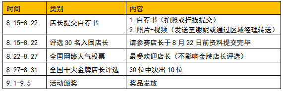 ② 報名要求:以門店為單位,每家門店推薦1名店長,參賽店長于8月22日前提交自薦書,具體表格,找本區(qū)域的區(qū)域經理索要。