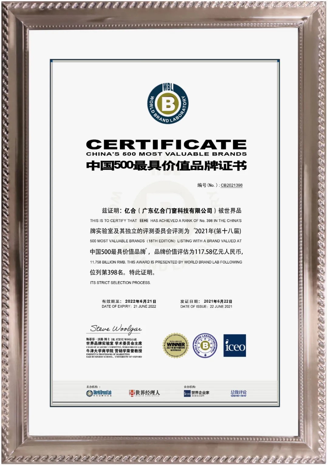2021年6月22日,由世界品牌實(shí)驗(yàn)室(World Brand Lab)主辦的(第十八屆)“世界品牌大會(huì)”在中國(guó)北京舉行,會(huì)上發(fā)布了2021年《中國(guó)500最具價(jià)值品牌》分析報(bào)告,億合門窗117.58億再次躋身中國(guó)500最具價(jià)值品牌。