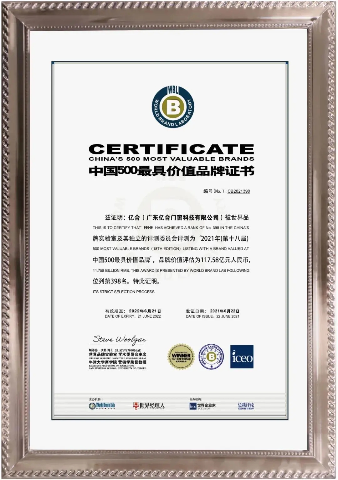 6月22日, 億合門窗以117.58億元的品牌價值再次躋身中國500最具價值品牌,同國家電網(wǎng)、騰訊、海爾、阿里巴巴、華為、中央電視臺、人民日報、中國一汽、五糧液等世界級品牌一同登榜。