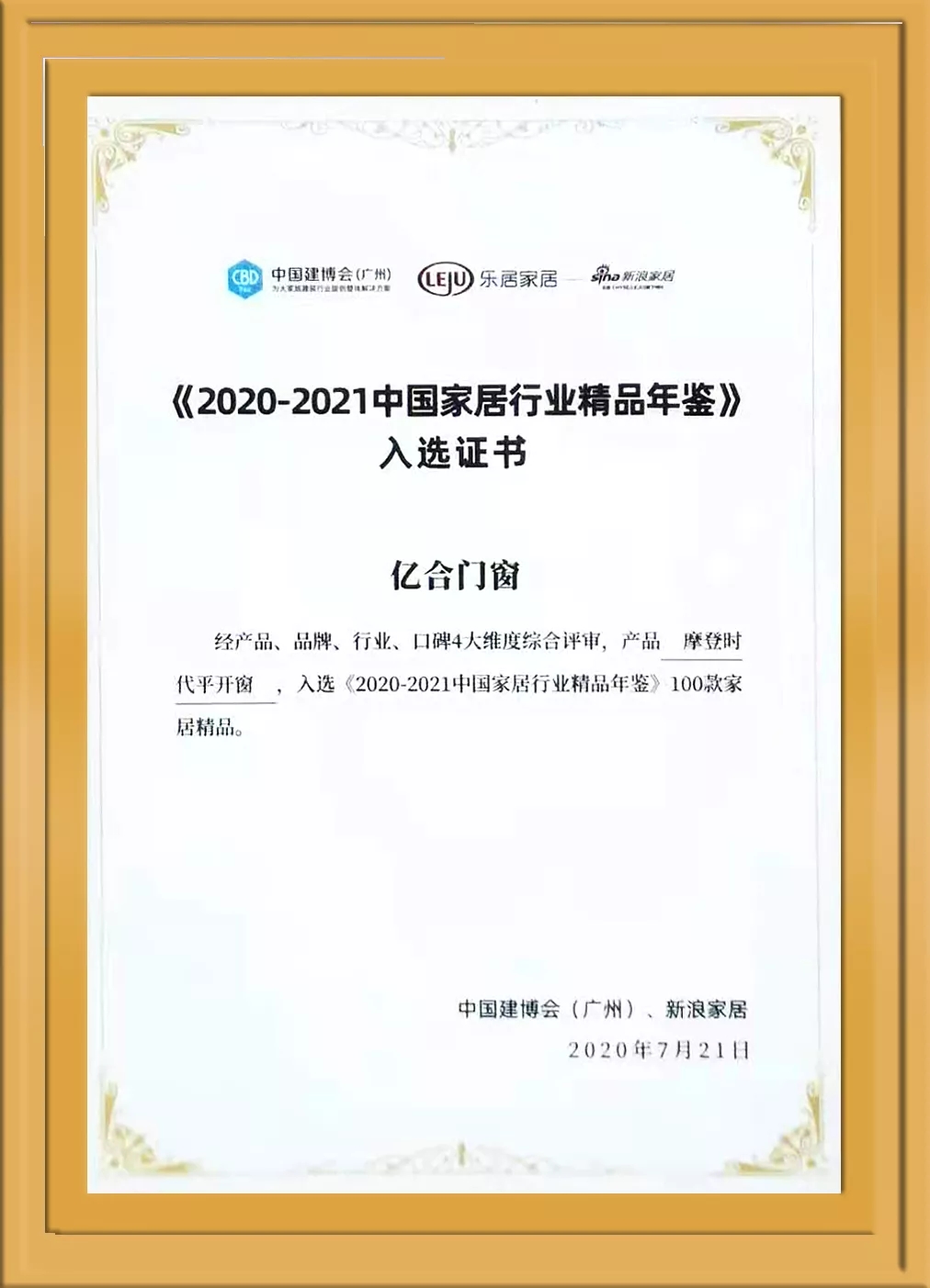 7月21日,由中國對外貿(mào)易中心(集團(tuán))主辦,中國建博會(廣州)和新浪家居聯(lián)合舉辦的《2020-2021中國家居行業(yè)精品年鑒》發(fā)布會于保利世貿(mào)博覽館完美落幕,億合門窗憑借優(yōu)質(zhì)的產(chǎn)品脫穎而出,成功入選年鑒。