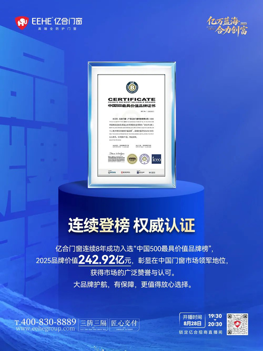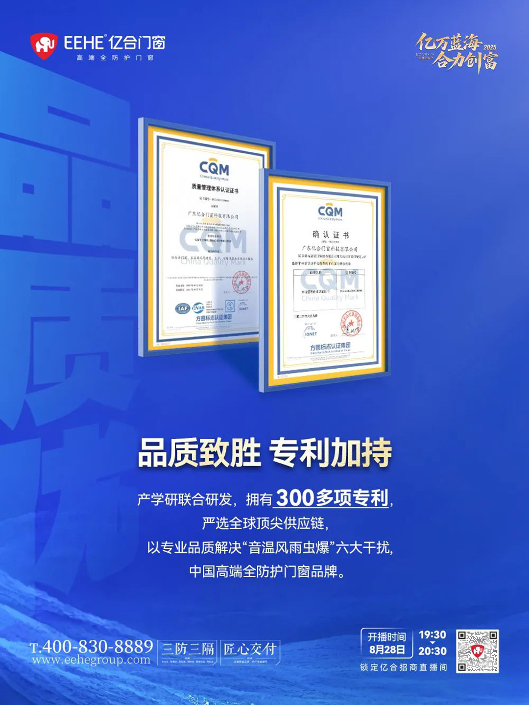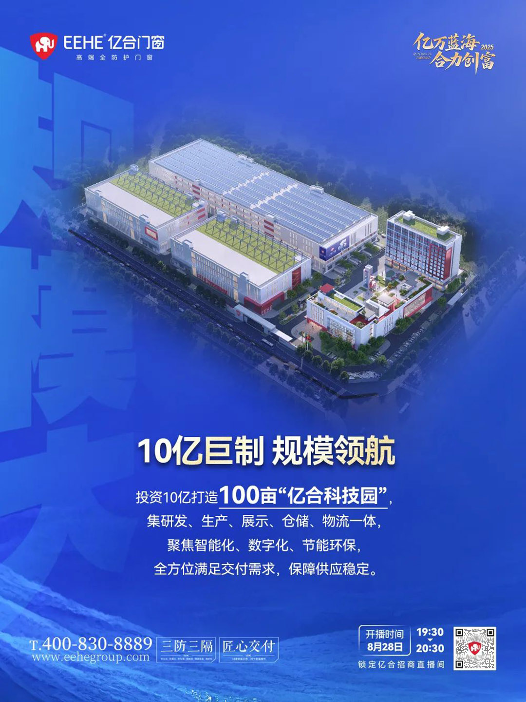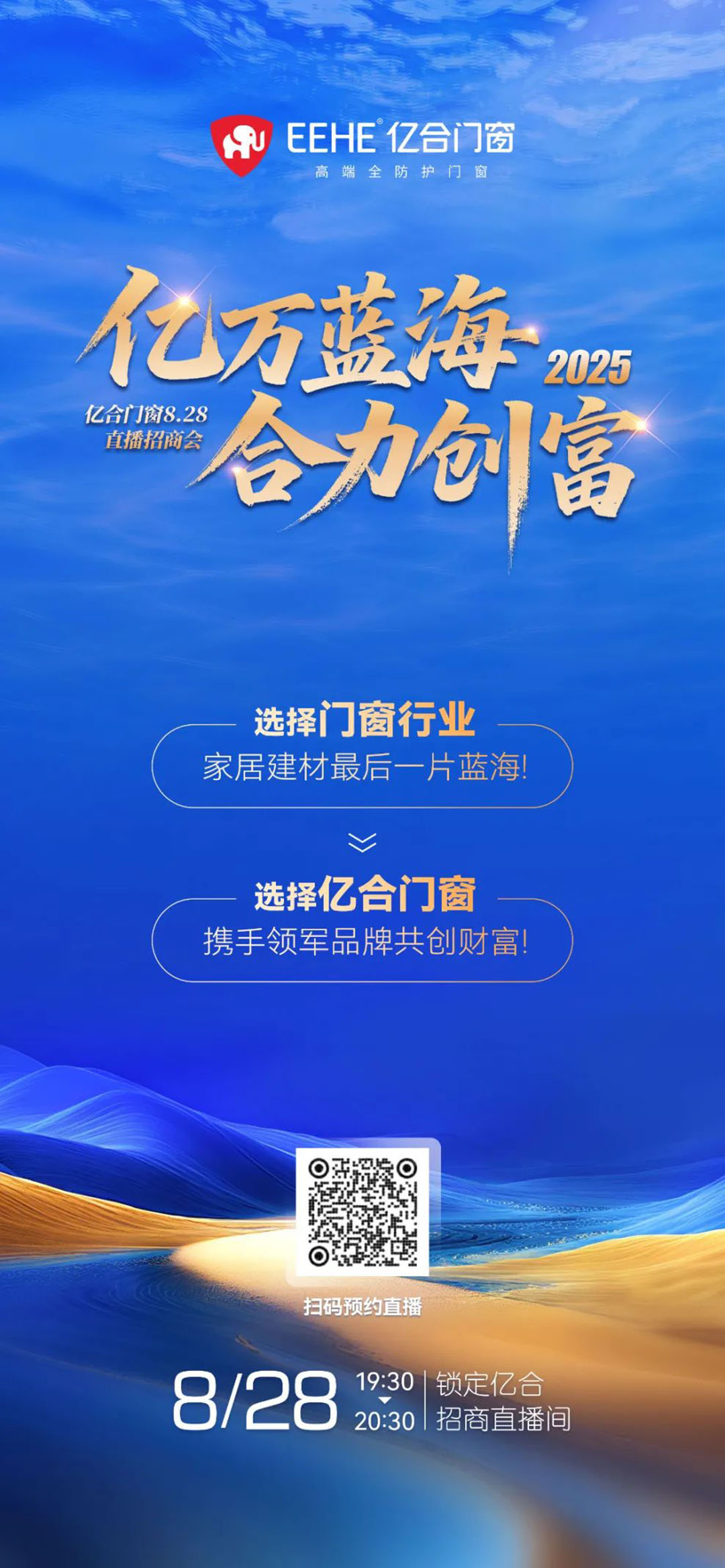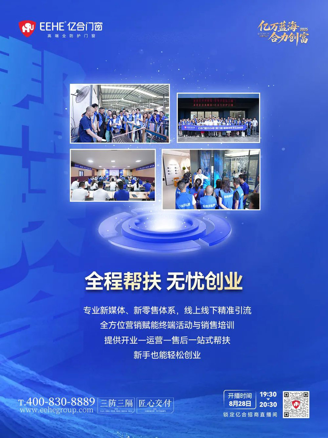 8月28日晚上19:30—20:30的直播招商會,將是一次不容錯過的財(cái)富機(jī)遇。在這場直播中,您將深入了解市場前景和億合門窗的品牌理念、產(chǎn)品優(yōu)勢、加盟政策。無論您是初入行業(yè)的創(chuàng)業(yè)者,還是尋求轉(zhuǎn)型升級的門窗從業(yè)者,億合門窗都將為您提供一個(gè)實(shí)現(xiàn)財(cái)富夢想的平臺。抓住時(shí)代機(jī)遇,開啟全新財(cái)富之路,億合門窗誠邀您掃二維碼預(yù)約,提前鎖定“億合門窗”官方視頻號直播間,共同搶占萬億門窗市場,共創(chuàng)財(cái)富未來!