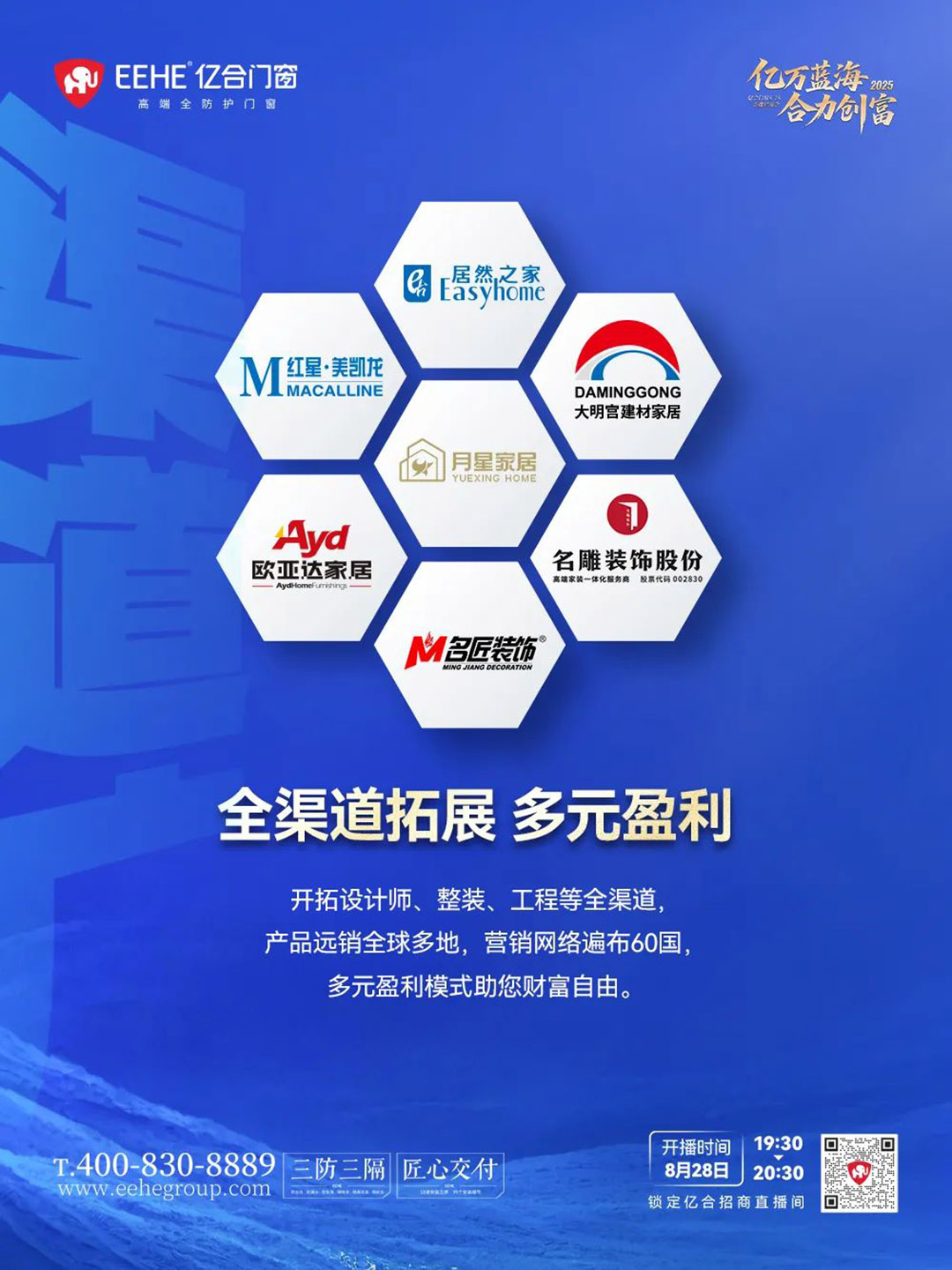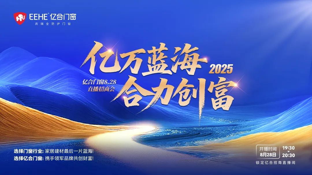 8月28日晚上19:30—20:30,“億萬藍(lán)海?合力創(chuàng)富”億合門窗8.28直播招商會即將火熱開啟。此次直播會將全面剖析門窗行業(yè)的發(fā)展趨勢,展示億合門窗的雄厚實(shí)力,并為廣大意向加盟商帶來極具吸引力的加盟政策、豐厚的惠商豪禮以及一系列互動驚喜,精彩內(nèi)容,不容錯過!