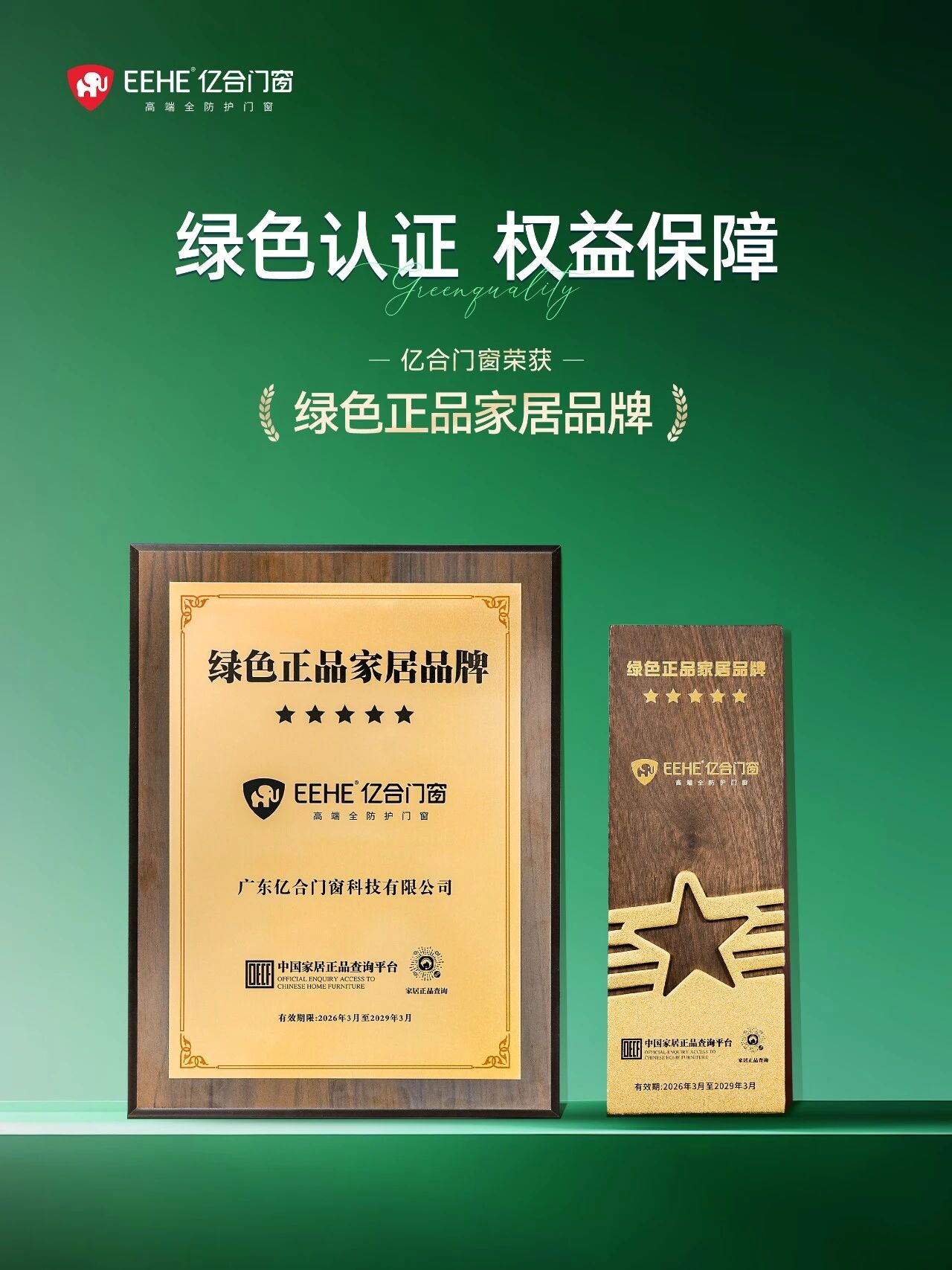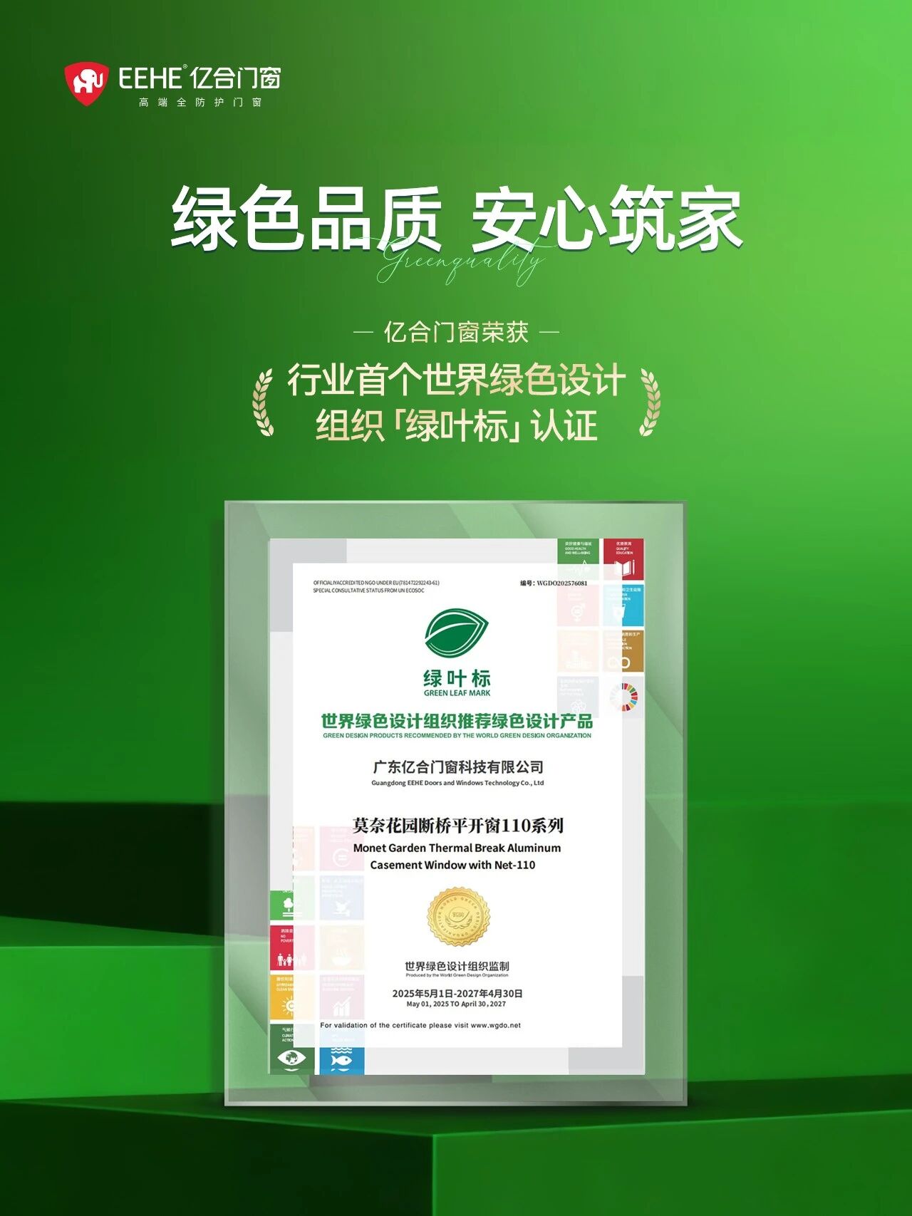 作為扎根佛山的門(mén)窗領(lǐng)軍品牌,億合門(mén)窗深度契合城市綠色發(fā)展戰(zhàn)略,將綠色理念融入產(chǎn)品全生命周期。從源頭嚴(yán)控環(huán)保選材,到生產(chǎn)環(huán)節(jié)推行低碳工藝,再到產(chǎn)品安裝、使用及回收的全流程綠色管控,全方位踐行“源頭綠色、全生命周期可持續(xù)”準(zhǔn)則,用至高標(biāo)準(zhǔn),給家綠色承諾。憑借對(duì)綠色理念的堅(jiān)定踐行與創(chuàng)新突破,億合門(mén)窗成為行業(yè)首個(gè)榮獲世界綠色設(shè)計(jì)組織“綠葉標(biāo)”認(rèn)證的門(mén)窗品牌,并獲得“綠色正品家居品牌”稱號(hào),以多項(xiàng)權(quán)威認(rèn)可,為消費(fèi)者提供綠色環(huán)保、節(jié)能安心的高品質(zhì)全防護(hù)門(mén)窗解決方案,筑牢家居健康與生態(tài)保護(hù)雙重保障。