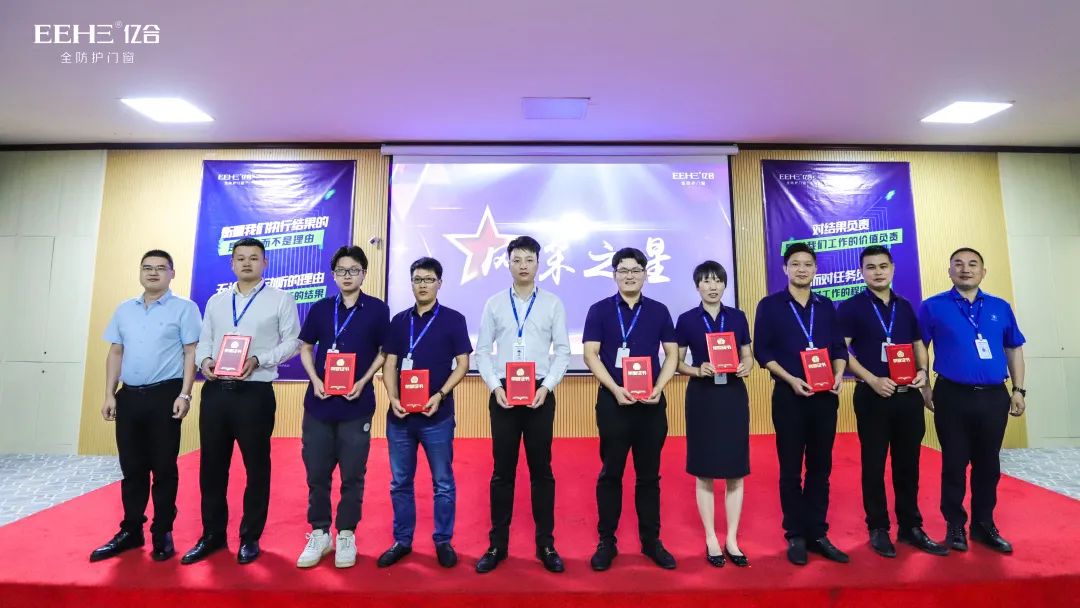 風采之星(從左二往右):運營中心葉平原、工程中心錢文俊、品牌中心魏英俊、招商中心周凜凜、財務中心杜洋洋、采購中心劉行安、產品中心章小洪、制造中心歐灶壽