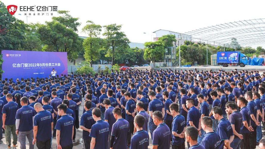 豐收的金秋季節(jié),奮斗的嶄新開(kāi)端。9月2日上午,億合門(mén)窗9月份全體員工大會(huì)在公司新擴(kuò)建的生產(chǎn)基地隆重召開(kāi),公司總經(jīng)理胡超攜全體員工1500余人共同出席了本次大會(huì)。