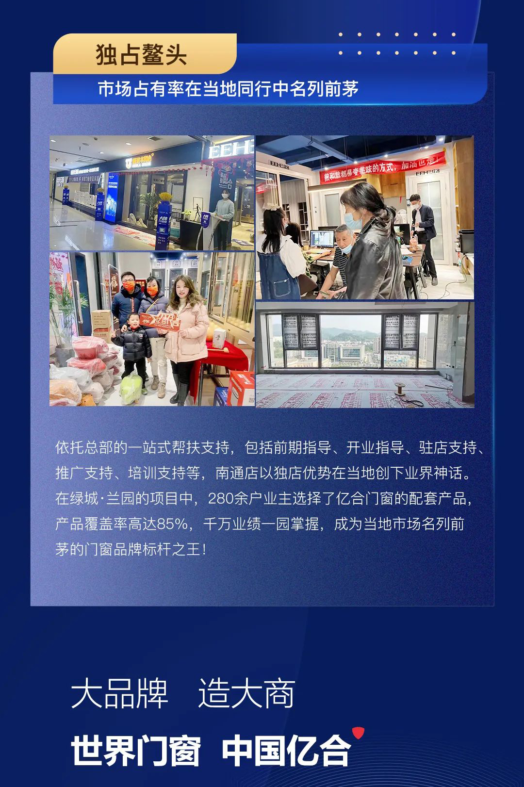 依托總部的一站式幫扶支持,包括前期指導(dǎo)、開業(yè)指導(dǎo)、駐店支持、推廣支持、培訓(xùn)支持等,南通店以獨(dú)店優(yōu)勢(shì)在當(dāng)?shù)貏?chuàng)下業(yè)界神話。在綠城·蘭園的項(xiàng)目中,280余戶業(yè)主選擇了億合門窗的配套產(chǎn)品,產(chǎn)品覆蓋率高達(dá)85%,千萬業(yè)績(jī)一園掌握,成為當(dāng)?shù)厥袌?chǎng)名列前茅的門窗品牌標(biāo)桿之王。